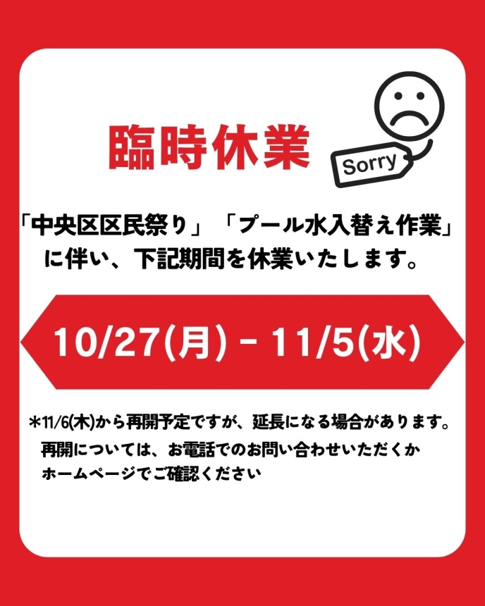 - 11月11日(火)~火曜アクアビクスが好評につき、2部制になります。