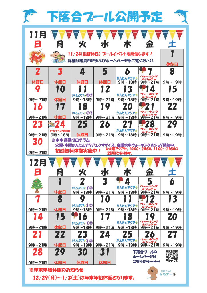 水中ウォーキング&ジョグ 11月の開催日を掲載しました。